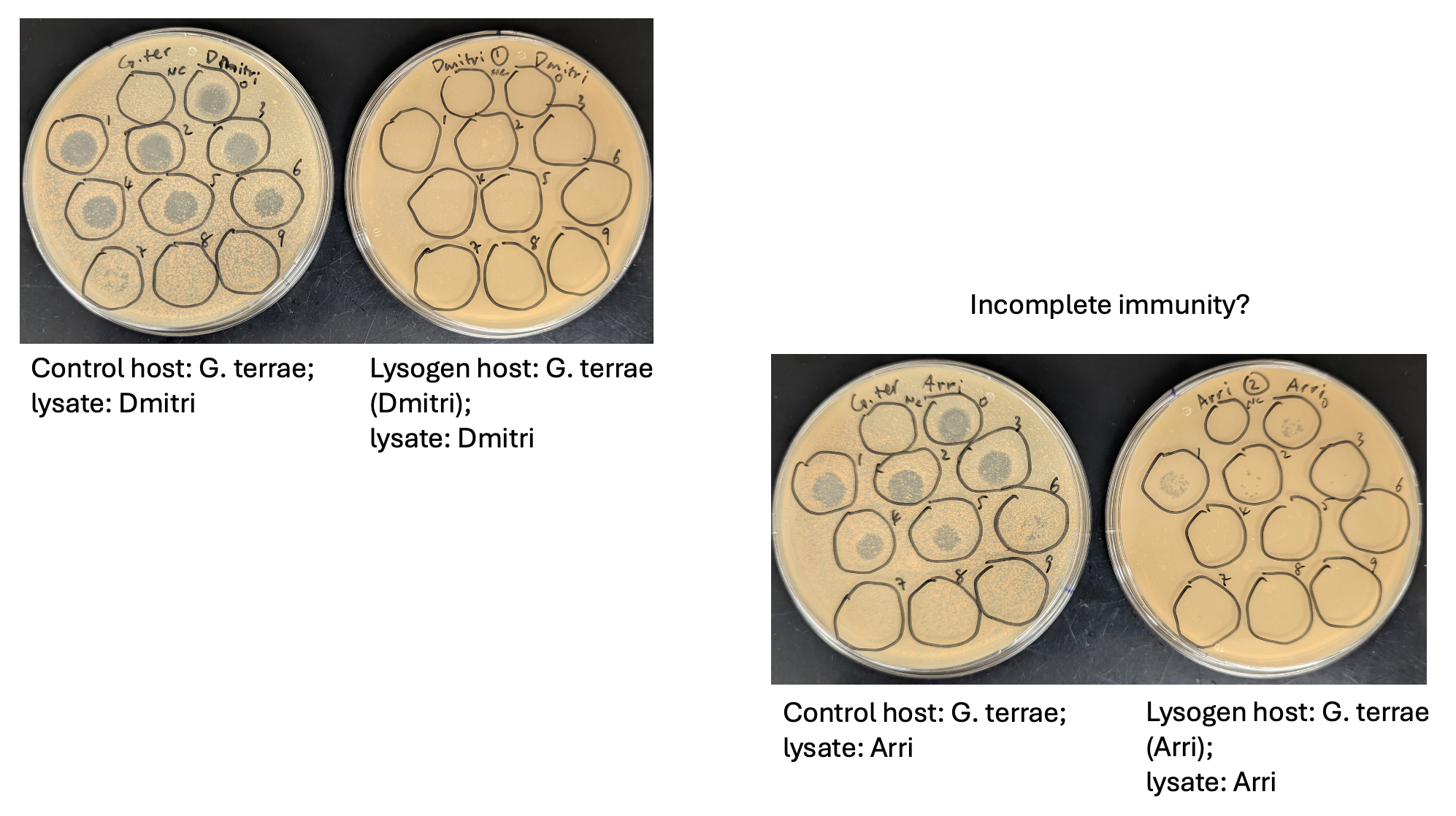 Thanks, Debbie and Vik. I’ve tried several times to attach the results slide as a PPT or JPG, but it isn’t going through. Would it be okay if I email the results instead? I’m trying to share the superinfection immunity test outcomes for phages Dmitri and Arri. Dmitri behaved as expected (no clearing or plaques on the lysogen lawn), but Arri’s results were unexpected (EOP ~10⁻⁴). I’d appreciate any thoughts you might have. Of course, we’ll need to repeat the experiments. |